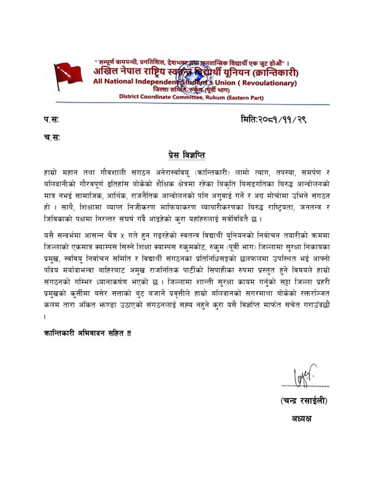 अखिल (क्रान्तिकारी) ले जिल्ला प्रहरी कार्यालय रुकुमपूर्वका डिएसपी माधव प्रसाद खरेललाई बर्दी खोलेर राजनीति गर्न सुझाव दिएको छ। आगामी चैत्र ५ गते हुने स्वतन्त्र विद्यार्थी युनियन (स्ववियु) निर्वाचनको तयारीका क्रममा रुकुम (पूर्वी) को सिस्ने शिक्षा क्याम्पसमा भएको छलफलमा खरेलले पदीय मर्यादाभन्दा बाहिर गई अमुक राजनीतिक दलको प्रवक्ताको भूमिका खेलेको भन्दै अखिल (क्रान्तिकारी) ले कडा आपत्ति जनाएको छ।
