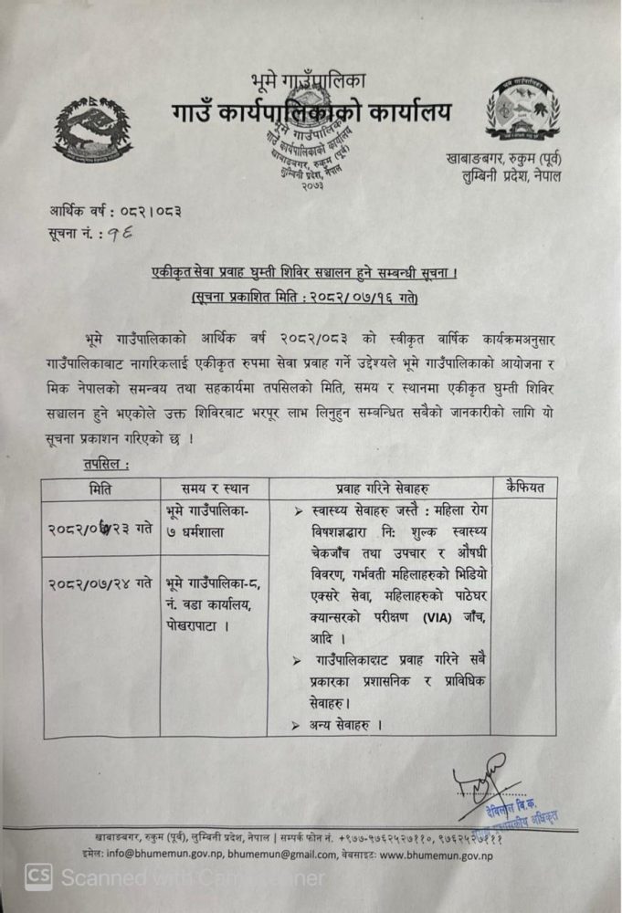 भूमे गाउँपालिकाले कार्तिक २३ र २४ गते नागरिकका लागि एकीकृत सेवा प्रवाह गर्ने उद्देश्यले ‘घुम्ती शिविर’ सञ्चालन गर्ने भएको छ । गाउँपालिकाको आर्थिक वर्ष २०८२/०८३ को स्वीकृत वार्षिक कार्यक्रमअनुसार स्वास्थ्य, सामाजिक तथा प्रशासनिक सेवा एकै ठाउँबाट सहज रूपमा उपलब्ध गराउने उद्देश्यले उक्त शिविर आयोजना गर्न लागिएको हो ।